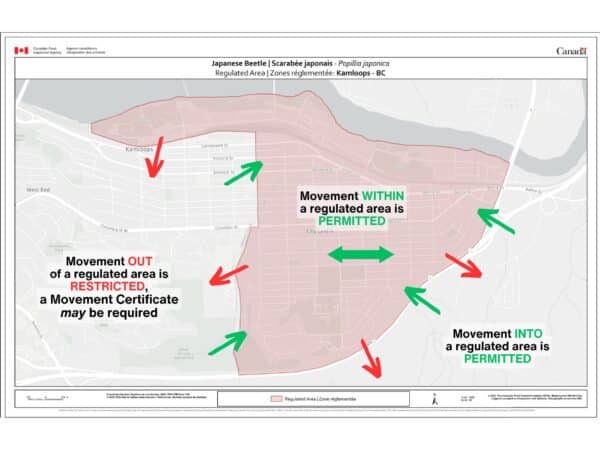 Japanese beetles were first found in B.C. in July 2017 in downtown Vancouver. In 2024, zero beetles were detected within the City of Vancouver for the first time – a significant milestone in eradication efforts! Despite this progress, movement restrictions (see Prevention Tips) remain in place to prevent reintroduction and further spread. In the same year, Japanese beetles were detected in Kamloops, leading to the establishment of a new regulated area. As of June 13, 2025, the regulated area now includes portions of Kamloops in addition to existing areas within the Cities of Vancouver, Burnaby and Port Coquitlam. While the population has declined in the Lower Mainland, many areas of B.C. continue to be monitored and managed for this invasive pest.